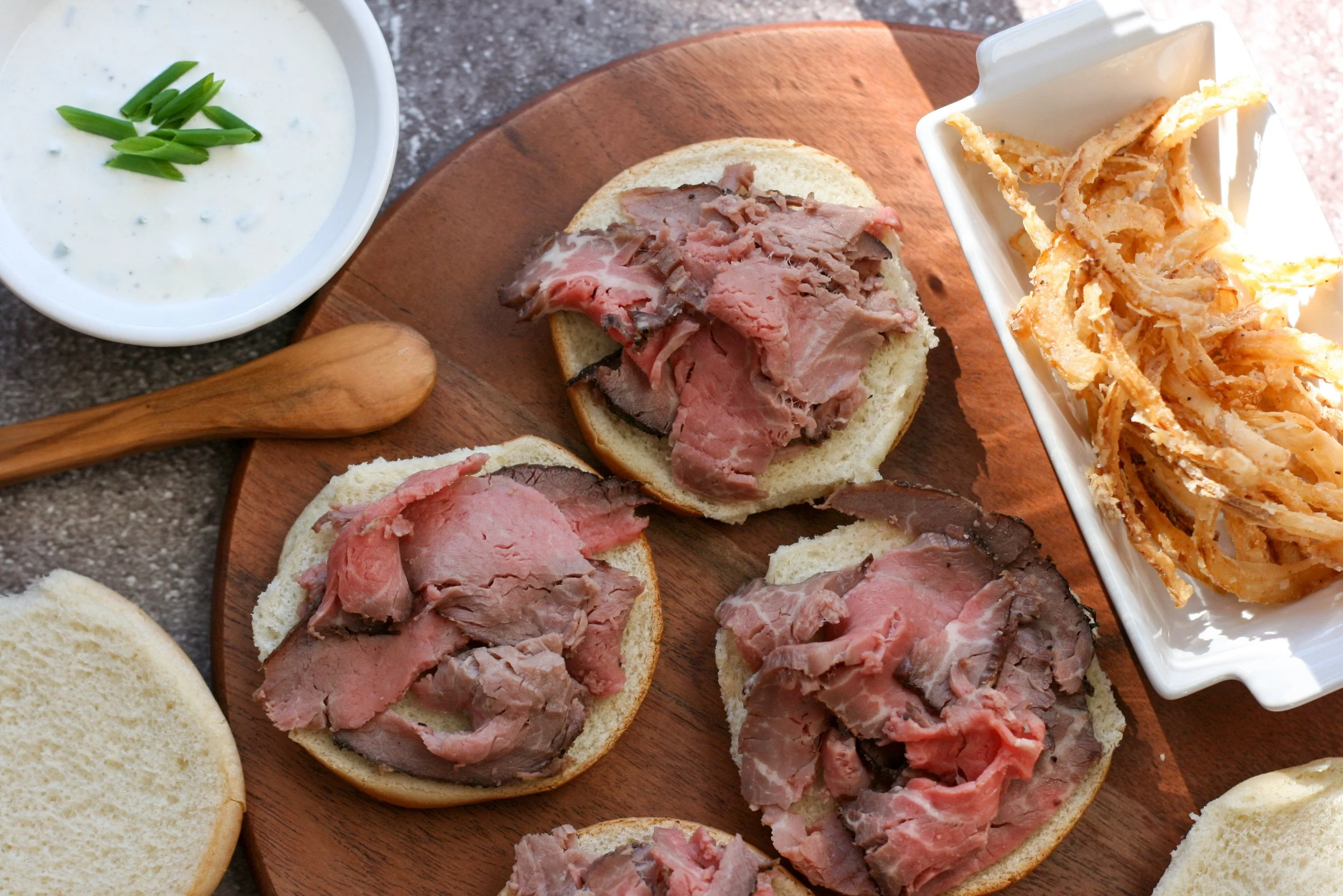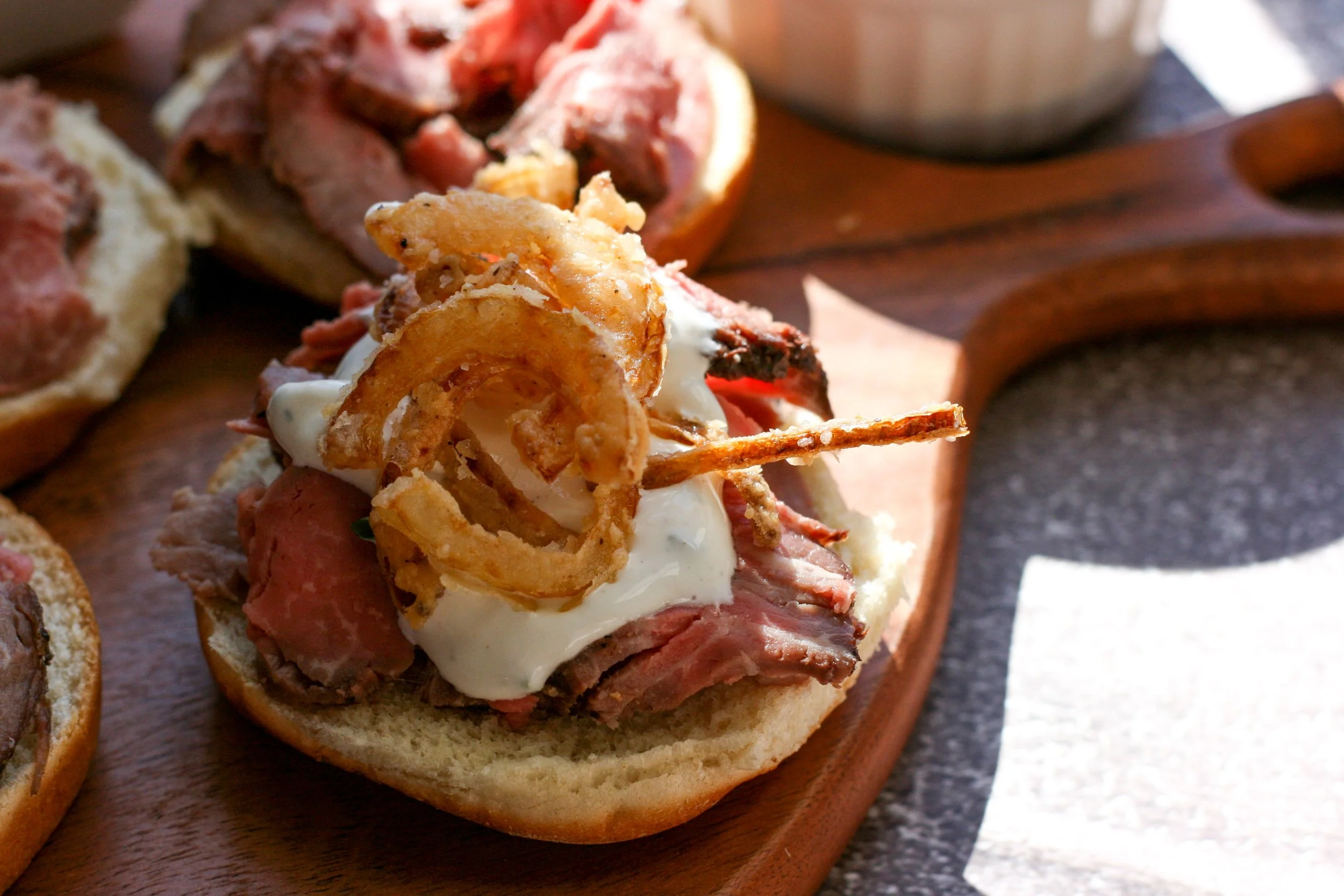 Beef Sliders with Crispy Onions and Horsey Sauce