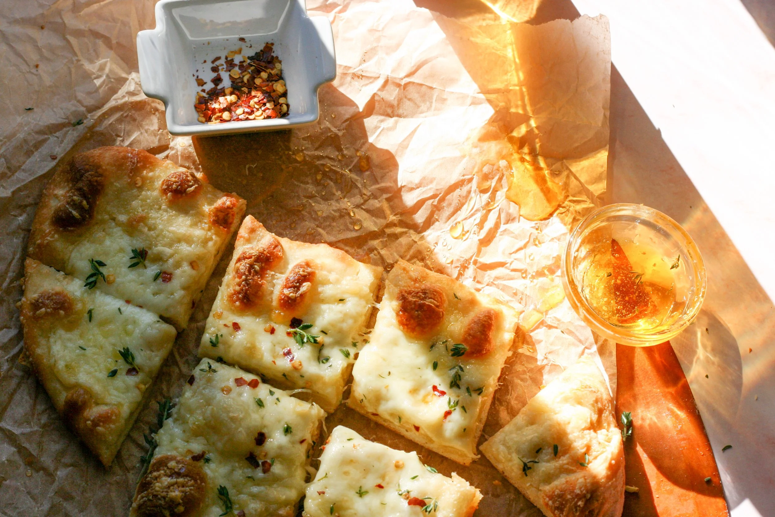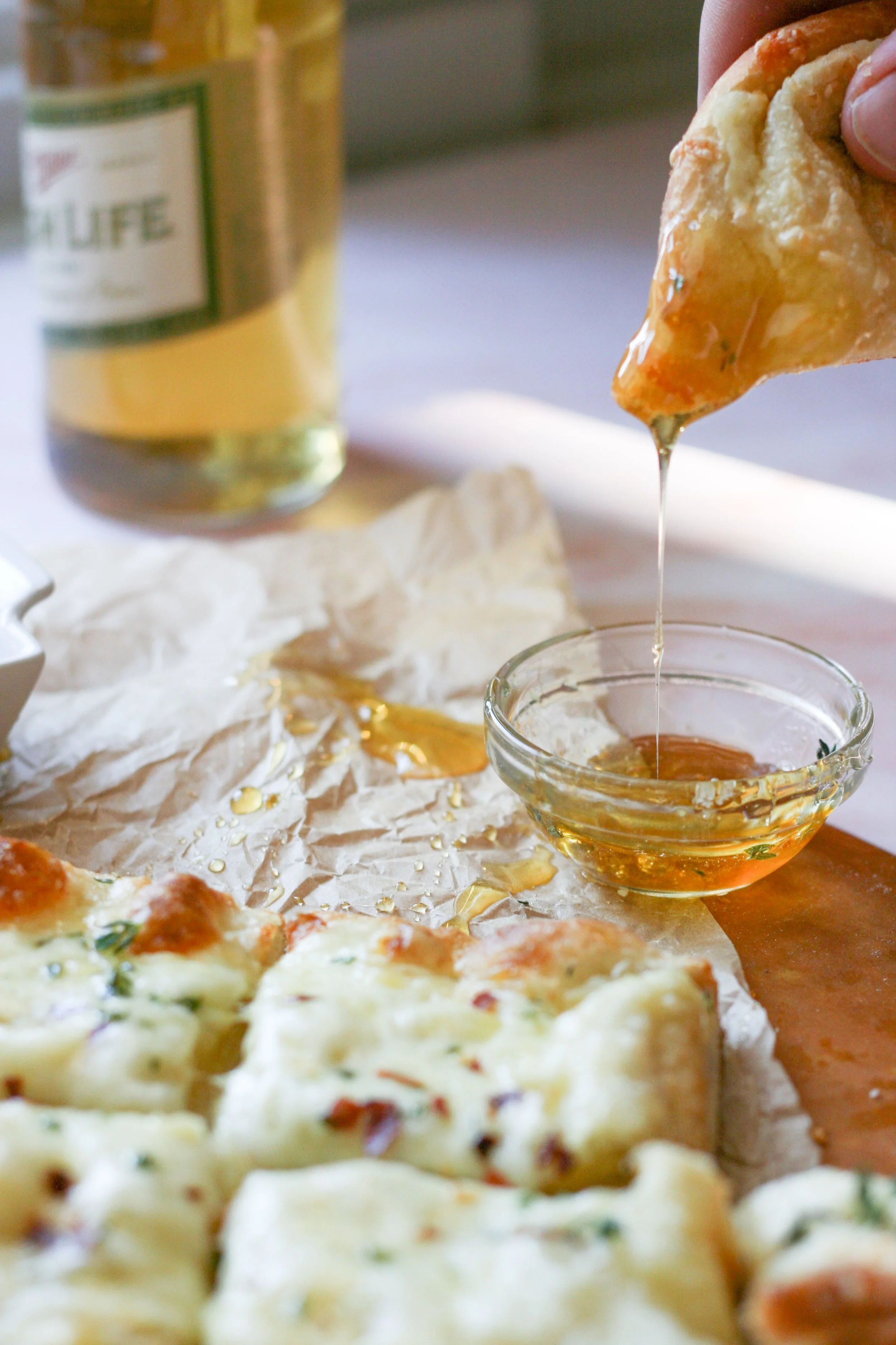 - Brush olive oil on entire crust. Evenly sprinkle 1 cup cheese and 1/2 the garlic. Slide the pizza into the oven and bake for 15 minutes, rotating the pizza half way through. Remove from oven and sprinkle the thyme. Drizzle the honey and top with crushed red pepper.