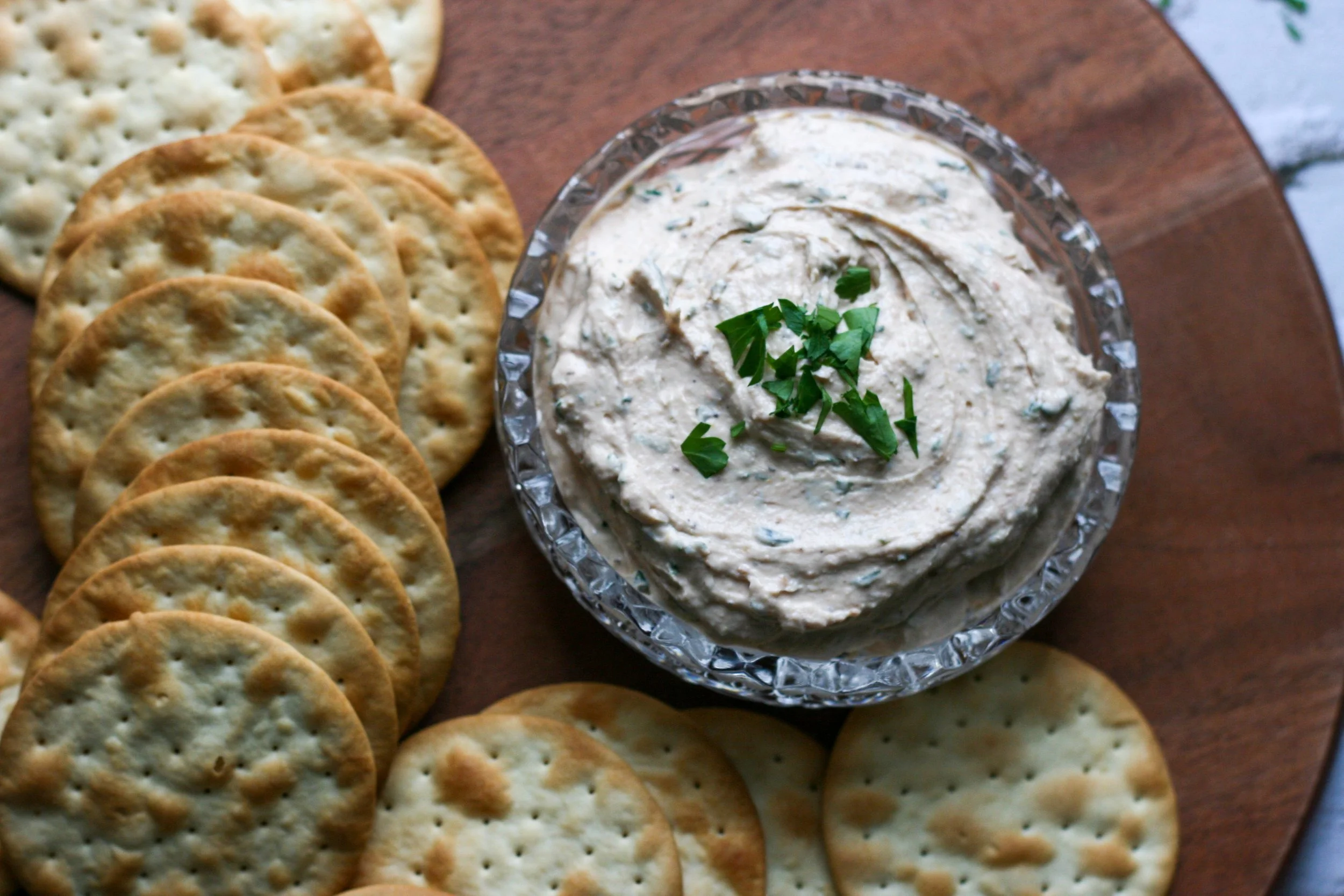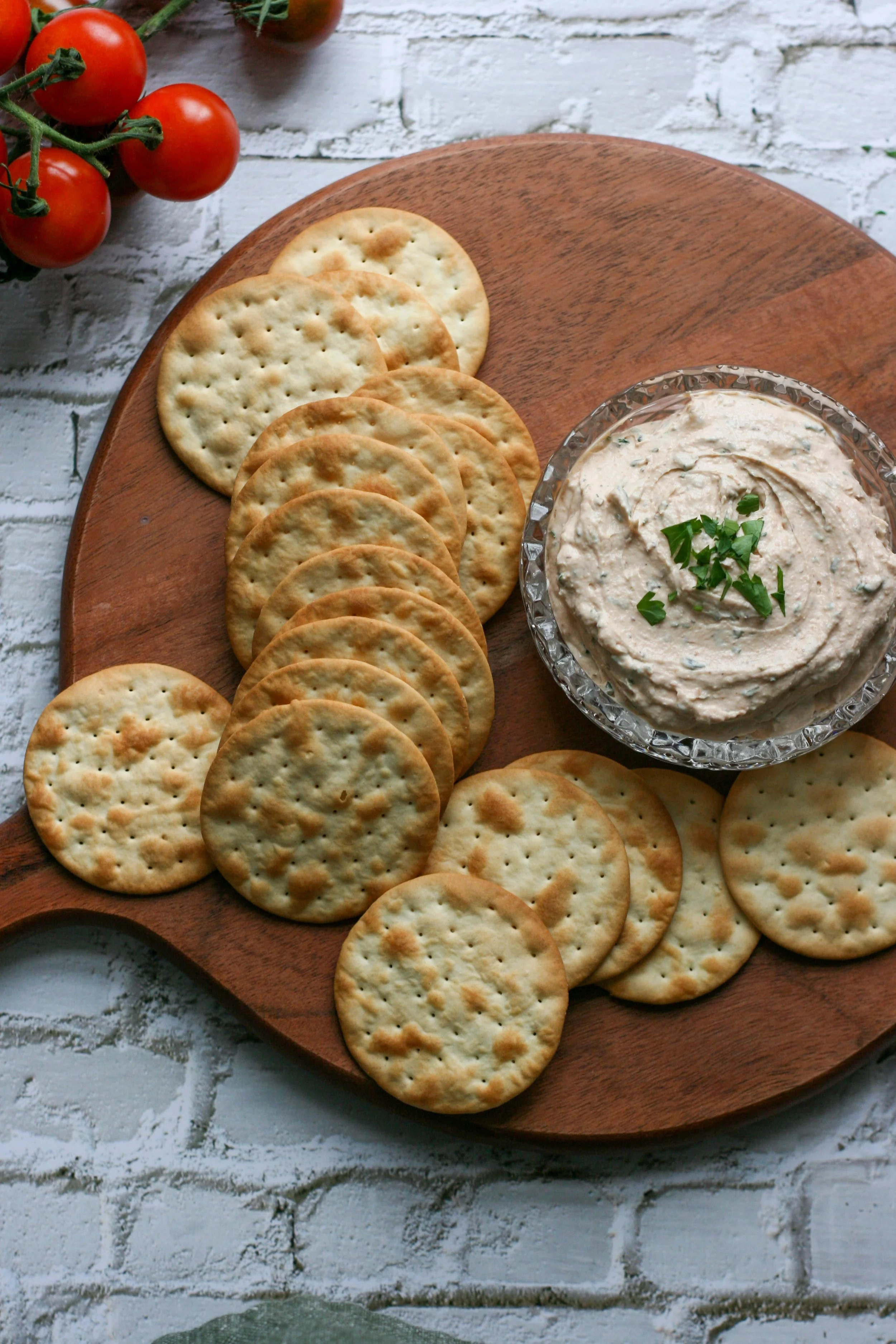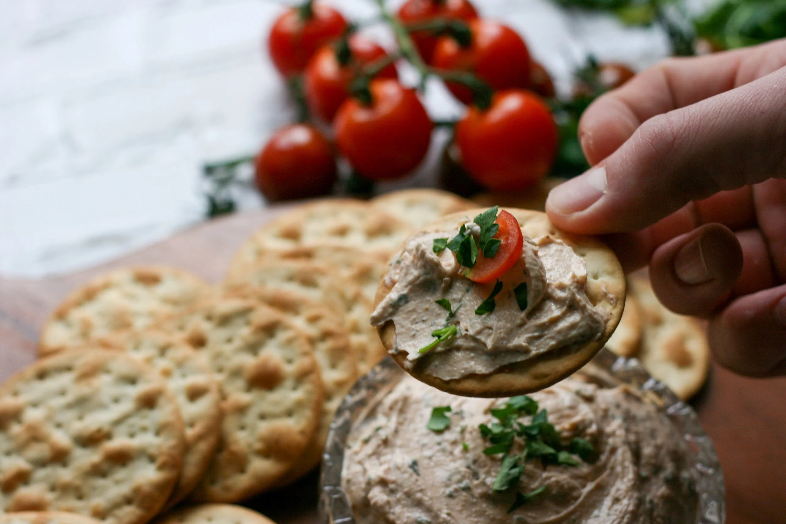 - Combine all ingredients in a bowl. Stir vigorously to meld together. Chill at least 1 hour in fridge. Top with herbs and a cherry tomato and serve with favorite cracker and/or fresh veggies.