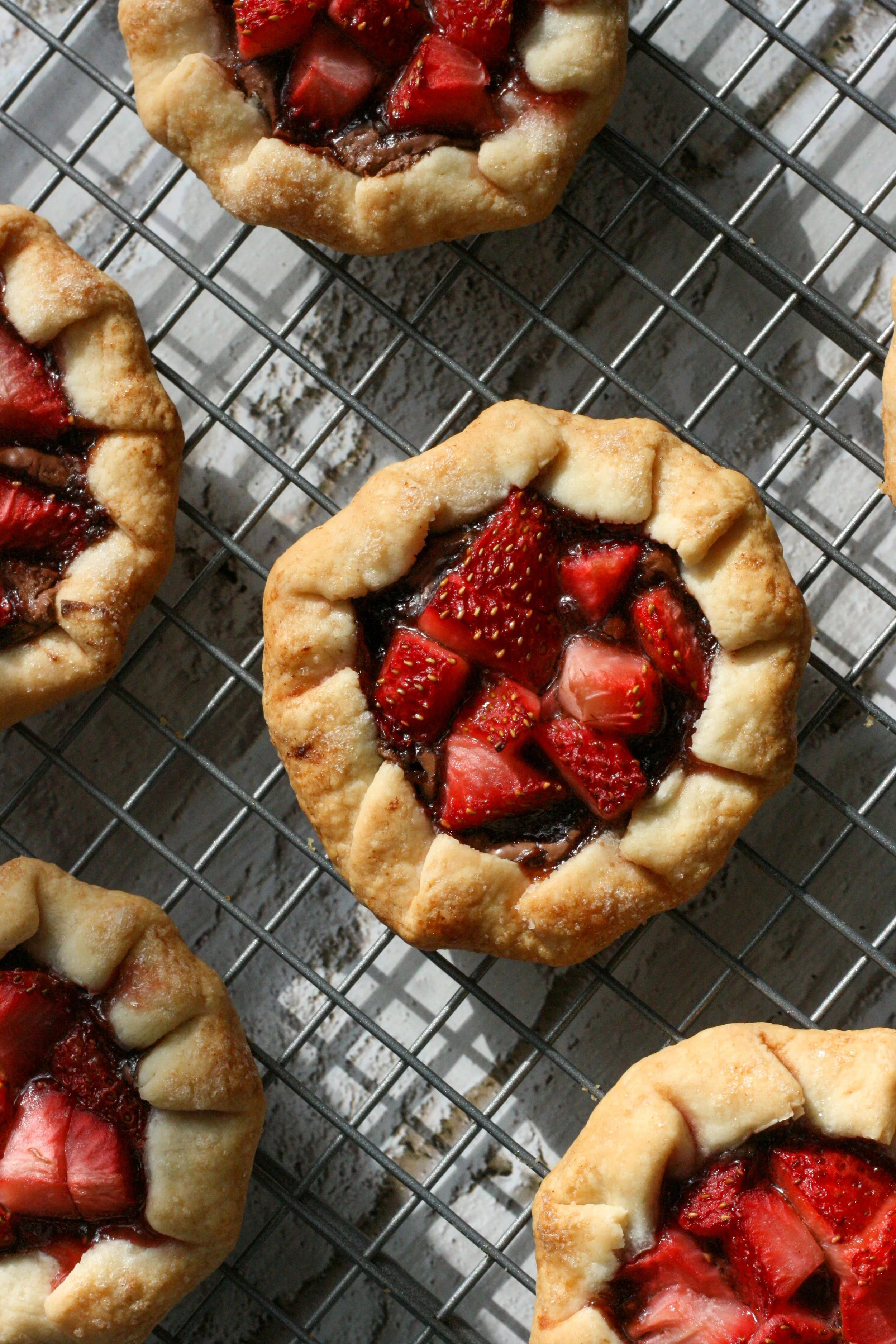 - For each small crust, spread 1 teaspoon of the Nutella in the center, leaving a 1 inch boarder. Top the Nutella with 1 tablespoon of strawberries. Crimp the edge of the pie crust, folding the boarder in towards the center.