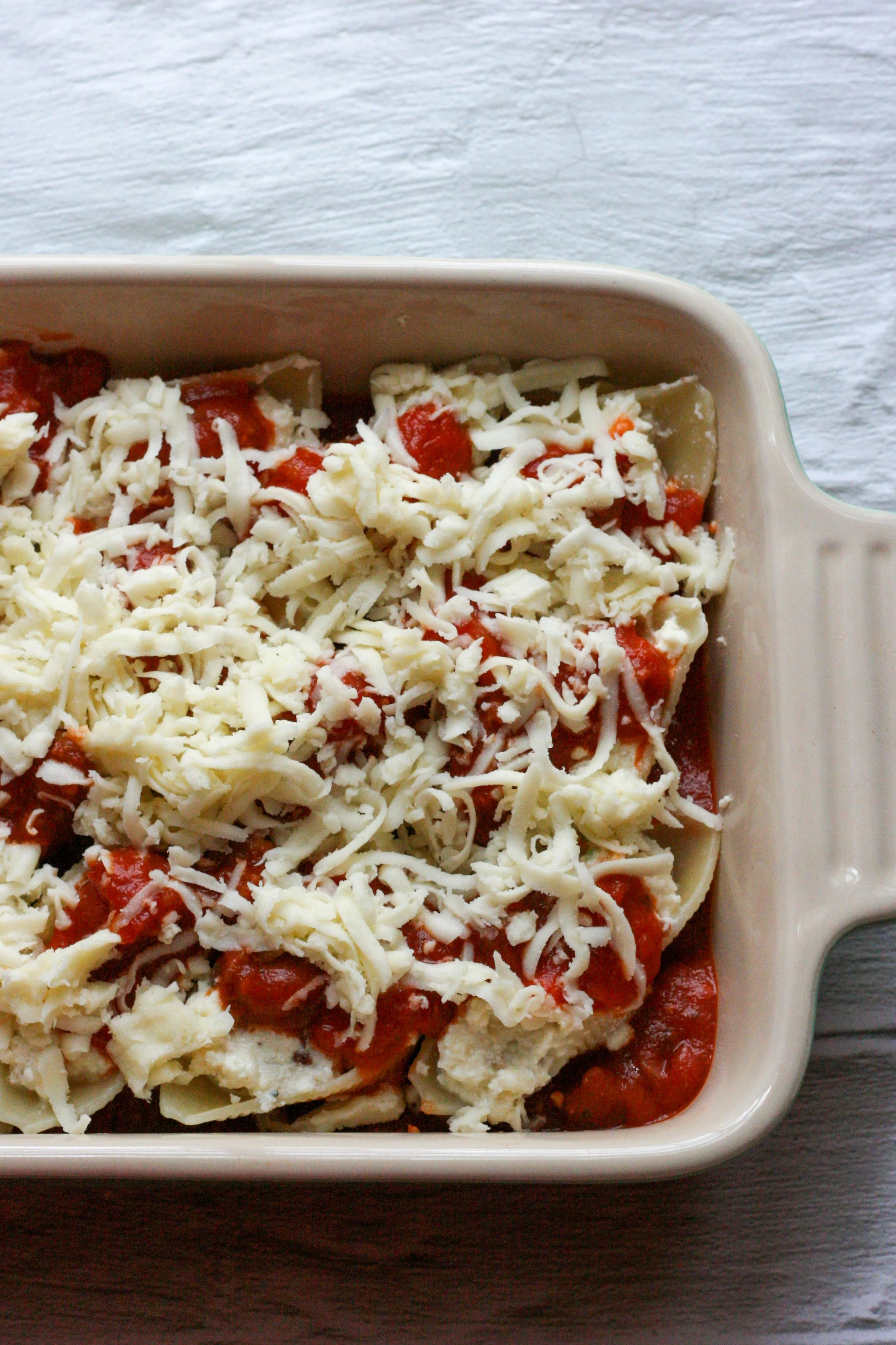 - Inside each shell, add 1 tablespoon of the ricotta mixture and place shells on top of the sauce in the dish. Layer the rest of the sauce on the top of the shells. Finish with the second cup of mozzarella.